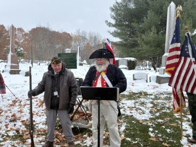 This marker has been erected under the countywide initiative by the Sons of the American Revolution to commemorate the patriots of the American Revolution buried at the cemeteries in Chautauqua County. Though it was a cold and snowy day, members of the community gathered in large numbers to celebrate the occasion on Veterans Day.