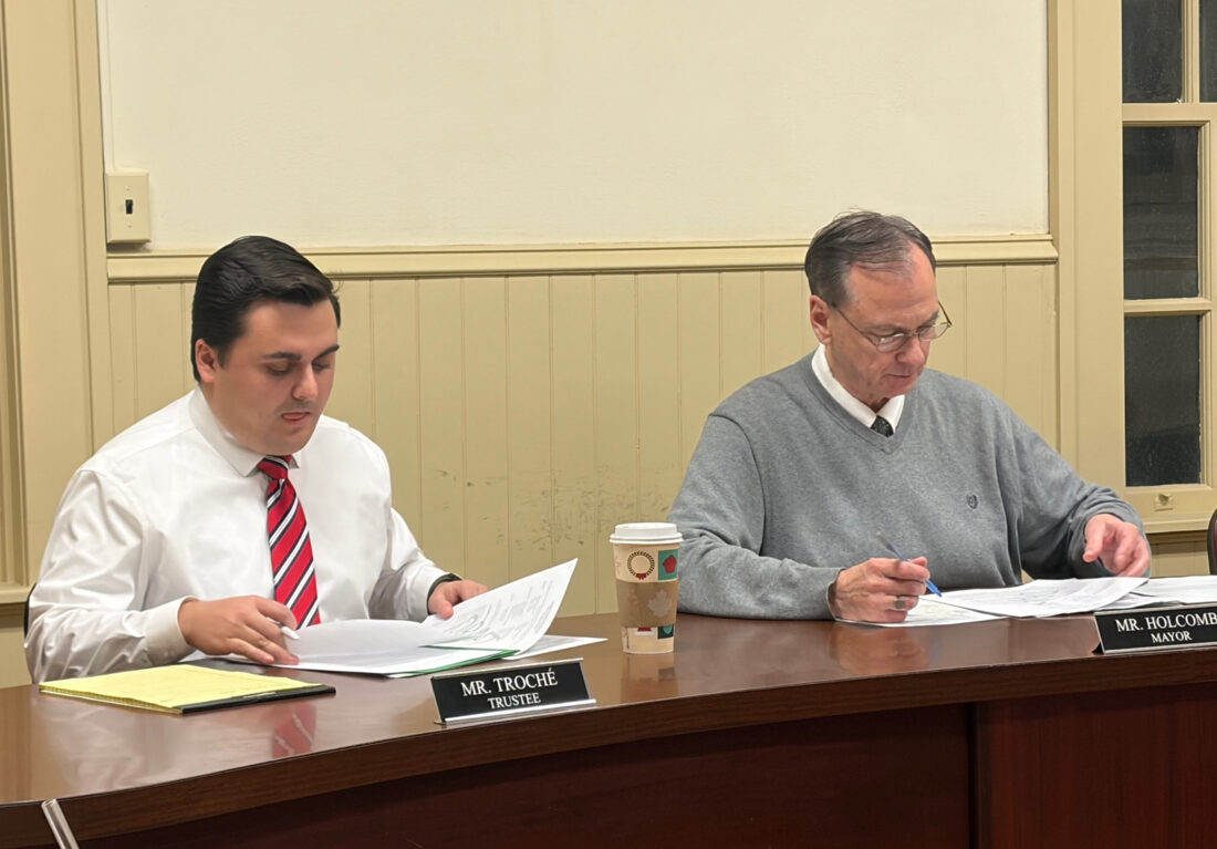 From left, Lakewood Village Trustee Ben Troche, and Mayor Randy Holcomb look over documents Monday at a village board meeting. P-J photo by Michael Zabrodsky