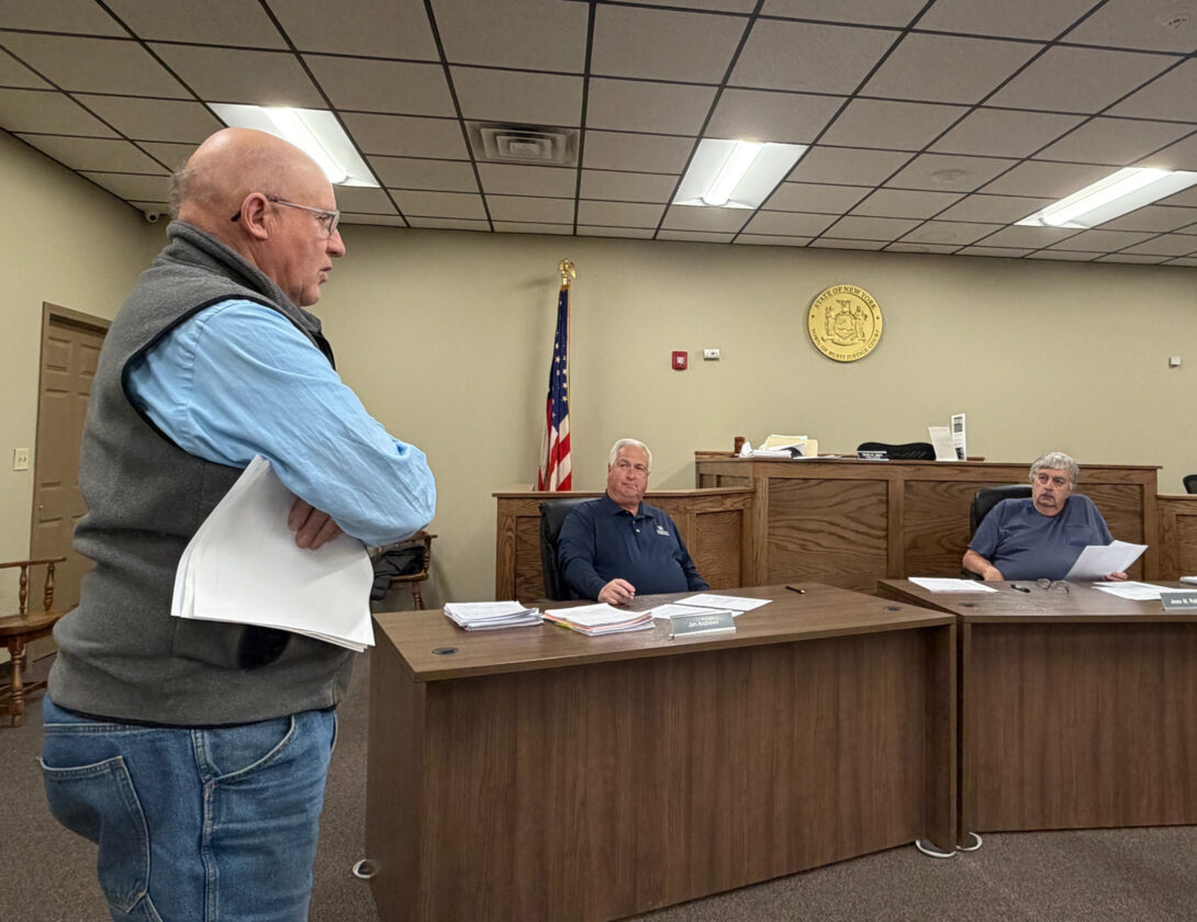 From left Lloyd Muncie talks to the Busti Town Board about a water connection fee. Town Councilman Jim Andrews, center, and Town Supervisor Jesse Robbins listen. P-J photo by Michael Zabrodsky