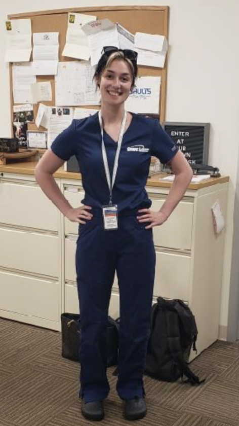 Madison Kehe on July 24, 2024 dressed in scrubs, ready to leave her job at Ed Shults Ford to drive to an evening class at Great Lakes Institute of Technology in Erie, PA.