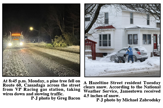 According to the National Weather Service on Monday, these totals were reported: Jamestown, 4.5 inches; Mayville, 4.3 inches; Falconer, 4.5 inches; Randolph, 4 inches; Bemus Point, 3 inches; Cassadaga, 2.8 inches; Perrysburg, 6 inches; and Silver Creek, 9 inches.