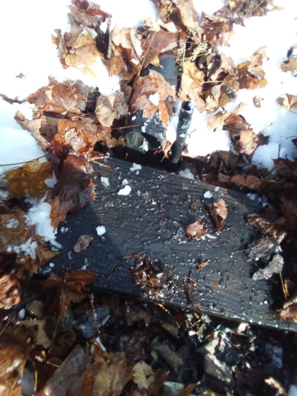 - Pictured is the current septic system for the house as of Nov. 13, which is just a black pipe coming straight out of the house onto the ground. Part of the barrel that used to hold the sewage can be seen rotted away underneath the board. Submitted photo