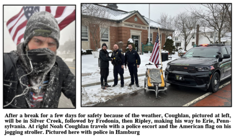 Because of the ongoing winter weather, his schedule can vary by day. He reached Fredonia on Thursday and hoped to reach Westfield by the end of the day.