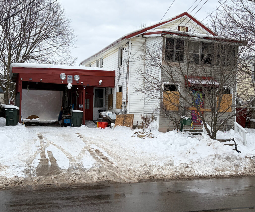 - Windows are boarded up after a fire Sunday at 523 Crescent St. P-J photo by Michael Zabrodsky