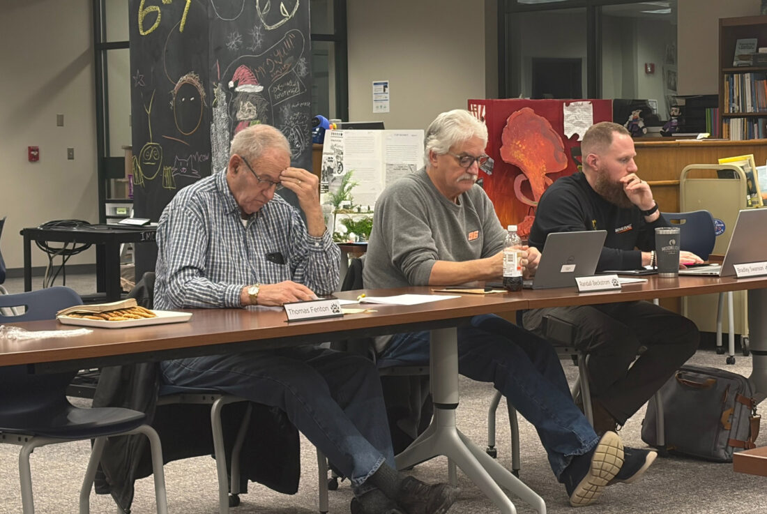 From left, Frewsburg Central School Board of Education Members Thomas Fenton, Randal Beckstrom, and Bradley Swanson, Thursday, view district documents. P-J photo by Michael Zabrodsky