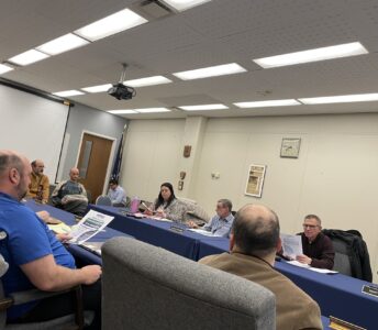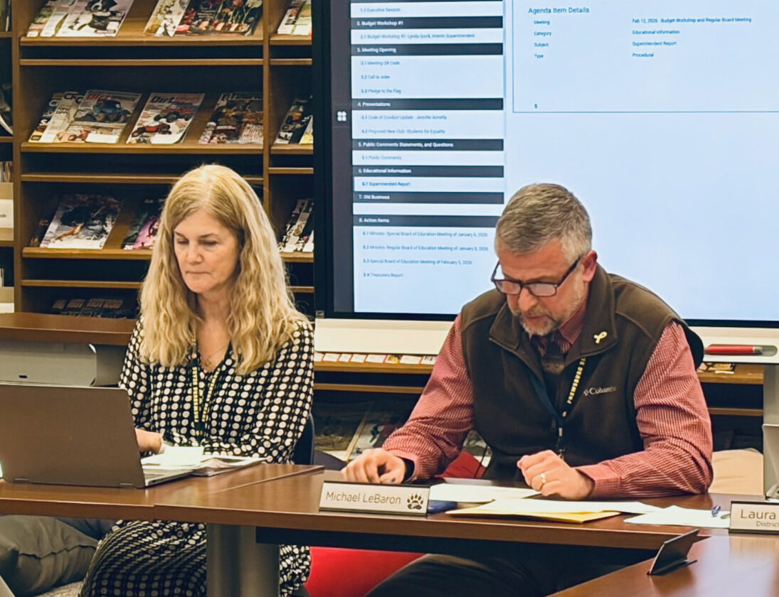 From left Frewsburg Central School Interim Superintendent, and Frewsburg Central School Board of Education President Michael LeBaron, look over district documents. P-J photo by Michael Zabrodsky