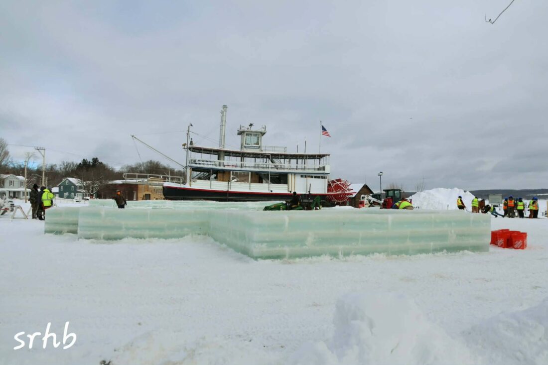 One of the individuals that detailed the building process was Jeff Lang of Lang Enterprises, one of the individuals that has devoted countless hours to the project. First is the way in which the blocks are cut. Lang stated that a makeshift wooden frame, which sits on a sort-of pair of skis, has the chainsaw mounted on it. This chainsaw can be pushed down into the ice, and the sled will then be moved to make the cut. Lang stated that the blocks are cut to measure 22 inches wide and 44 inches long, with the ice being about a foot in width. Many of these blocks are also more clear than in past year, said Lang. This is because the ice has remained consistently frozen throughout this season, whereas constantly freezing creates more cloudy ice.