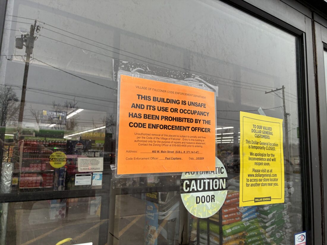 The violation, and closure, was issued by Paul Capitano, Falconer code enforcement officer, who said a complaint was received nearly two weeks prior to the closure from a concerned resident who said the store has a host of problems with the roof, leading to multiple leaks forming throughout the building.