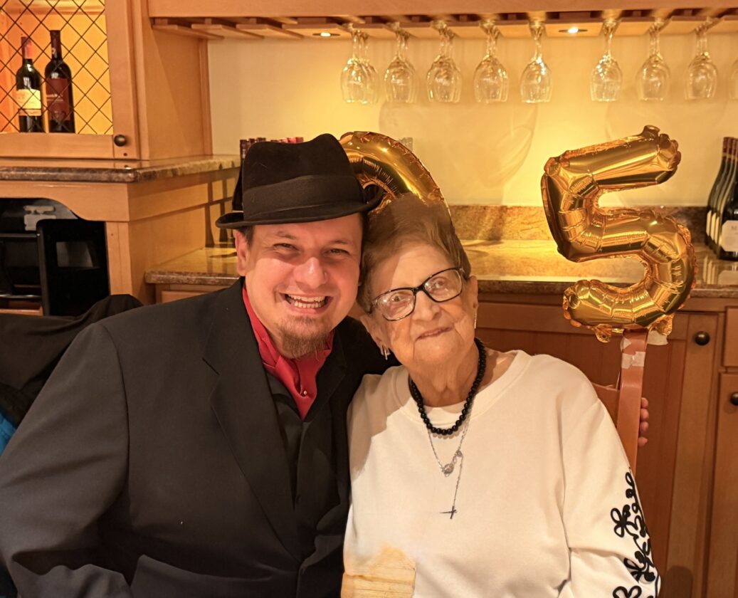 - Teresa LaPlaca is pictured with Angelo Giuffre who sang Frank Sinatra songs for her during the birthday celebration. Submitted photo