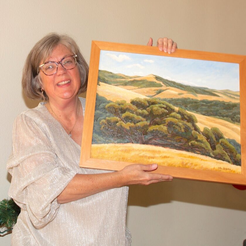 Stacy Demangate holding a painting during a party in her honor at the California Nature Art Museum back in December, 2025. P-J file photos