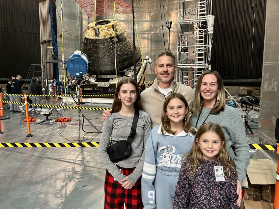 - Laurie Abadie and her family in November 2024 at NASA’s Neil Armstrong Test Facility in Sandusky, Ohio, standing in front of the Orion vehicle that launched on the Artemis I mission.