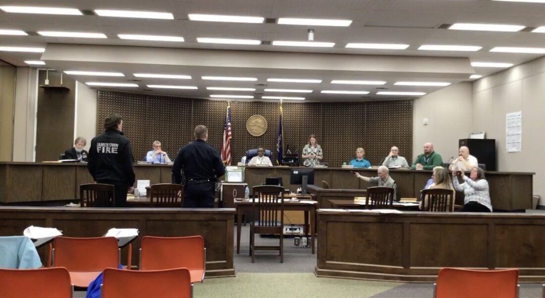 Scott Forster and Ryan Roush read their oaths to the city council as they were officially appointed as Police Chief and Acting Fire Chief for the city. Screenshot courtesy of the city of Jamestown’s website
