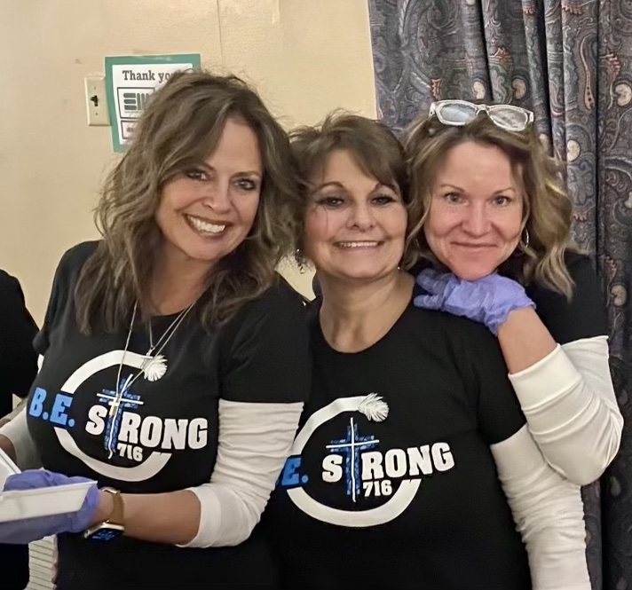 - Junie Eimiller, B.E. Strong 716 founder and CEO, is pictured with volunteers Joann Murray and Missy Kwiatkowski. Below, The B.E. Strong volunteer “team” assisting at a fundraiser for Aspire. Submitted photos
