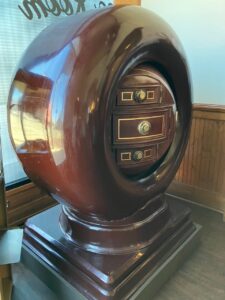 A unique round safe stood in the entryway. Framed vintage puzzles of television shows such as Wagon Train, Sergeant Preston, Gunsmoke and Roy Rogers hung across the room. The walls of the dining room were decorated with local historic photos and various antiques. Near the kitchen, the original bank vault was used for a pantry.