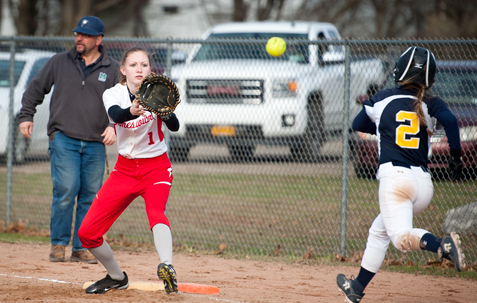 - Jamestown first baseman Karleigh Haines awaits a throw during non-league action against Frewsburg on Wednesday at the Robert H. Jackson Sports Complex. P-J photo by Valory S. Isaacson