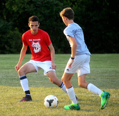 Above, Southwestern’s Esteban Diaz marks a teammate during practice Monday. P-J photos by Cody Crandall