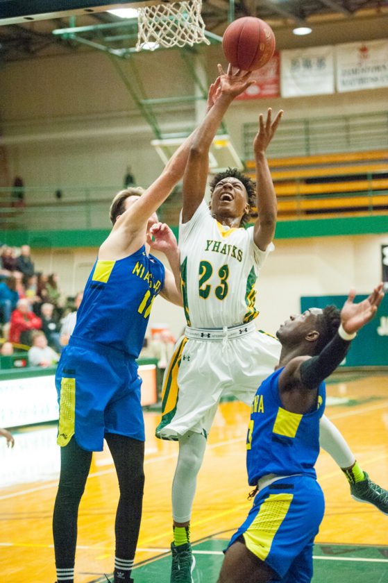 - Jamestown CC’s Keshawn Howard attempts a shot over Niagara County CC’s Fran Murcia (11) and Laterrance Reed during Wednesday evening’s NJCAA Region 3 Division II game at the Physical Education Complex. P-J photo by Valory S. Isaacson