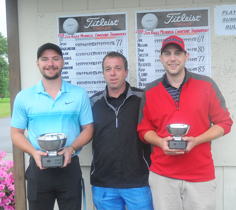- Jackson Valley Golf Club pro Eric Gurdack, center, is surrounded by the first- and second-place finishers at the 29th annual Jim Riggs Memorial Champions on Sunday. Representing Cardinal Hills Golf Course and Chautauqua Golf Club is winner Nolan Ditcher, left. At right is Blueberry Hill Golf Club’s Joe Nelson, who finished second. P-J photo by Scott Kindberg