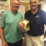 Chautauqua Sports Hall of Fame inductee Chuck Crist (Class of 2015), right, paid a visit to the Hall of Fame in Jamestown on Monday with former San Franciso 49ers teammate Steve DeBerg, who was a quarterback in the NFL for 21 years. The two men were teammates with the 49ers in 1978, and have remained friends for the last 40 years. The helmet they’re holding — minus the face mask — once belonged to Crist, who has since donated it to the CSHOF. Photo courtesy of Randy Anderson