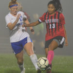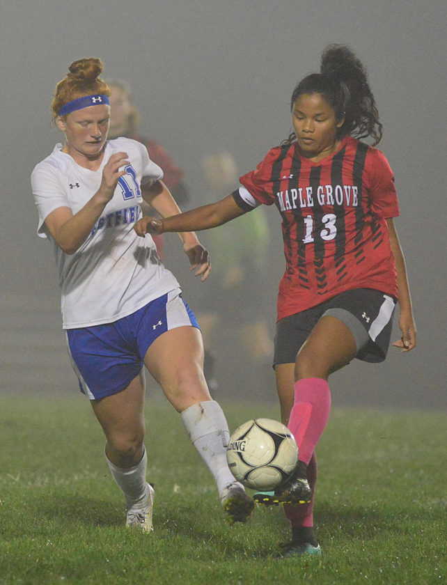 - Maple Grove’s Morgan Plymel, right, and Westfield/Brocton’s Juli Smith make a play on the ball at the same time during Monday’s West Division girls soccer game in the fog on Dutch Hollow Road. P-J photo by Scott Reagle