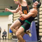 Jamestown Community College’s Daniel Torres, right, controls Adam Greeman during a 174-pound match at the JCC Open on Sunday at the Physical Education Complex. Torres and teammate Cam Page, who won three matches apiece, both took second place after losing in the finals by decision. Also securing victories for the Jayhawks, but falling short of medaling, were Nick Kozlowski (141), Ben Winkler (141), Wyatt Holley (197) and Nick Jones (285).