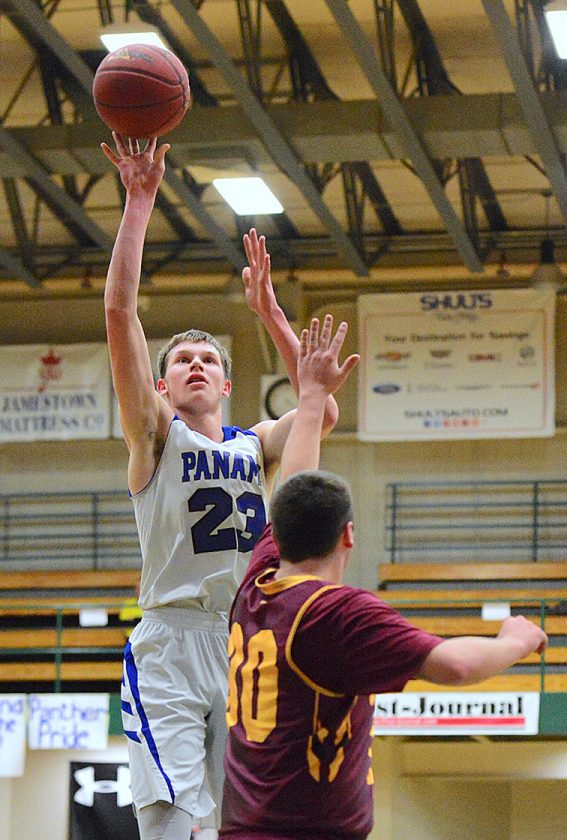 - Panama’s Cameron Barmore shoots a floater over Clymer’s Connor Beal during Monday’s Section VI Class D semifinal at the Physical Education Complex at Jamestown Community College. P-J photos by Scott Reagle