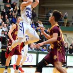 Clymer’s Lucas Willink (22) drives to the basket between Panama defenders Gerrit Hinsdale, left, and Dominic Spontaneo, right.