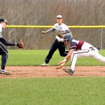 Bobby Samuelson waits to apply a tag to Chautauqua Lake’s Zach Fischer during CCAA Division 1 West action Monday in Mayville. P-J photos by Lisa Monacelli