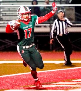 Jamestown’s Jaylen Butera dives for the end zone for a Red Raiders’ touchdown during Friday’s Section VI Class AA quarterfinal against Frontier at Strider Field. P-J photos by Chad Ecklof