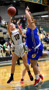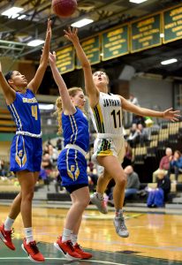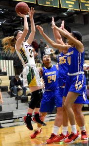 - Jamestown Community College’s Abi Lisciandro attempts a layup while being defended by Genesee CC’s LisBeth Pineda Polanco (4) and Haley Alvord (3) during Saturday’s NJCAA Region 3 Division II women’s basketball game at the Physical Education Complex. P-J photo by Matt Spielman