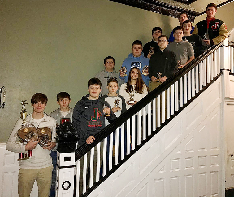 The Jamestown High School wrestling team held its season-ending banquet and the following wrestlers received awards: From the left are Dwayne Hannold, most takedowns, Mike Carney Award (best dual record), Jim Ross Award, most pins and Most Valuable Wrestler; Taylor Crofoot, most near-fall points, most improved and Section VI qualifier; Jameson Trusler, Red& Green Award; Cole Bloomquist, most escapes; Darren Pollaro, Coach’s Award; Skylynn Tomlinson, Section V/VI girls qualifier; Caleb Bane, most reversals and most improved; Keith Miller, most technical falls; Michael Houghton, Coach’s Award; Connor Hallet, most improved; Aric Bloomquist, Red & Green Award; Ben Schrader, Coach’s Award; and Dan O’Brien, Red & Green Award.
