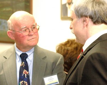 In this Feb. 18, 2013 file photo, former Southwestern Central School wrestling coach Walt Thurnau, left, chats with Bruce Baumgartner, the retired American freestyle wrestler and current assistant vice president for university advancement and former athletic director at Edinboro University at the Chautauqua Sports Hall of Fame induction banquet. P-J file photo