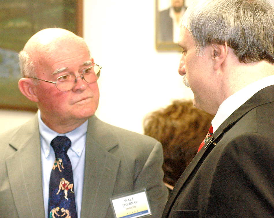- In this Feb. 18, 2013 file photo, former Southwestern Central School wrestling coach Walt Thurnau, left, chats with Bruce Baumgartner, the retired American freestyle wrestler and current assistant vice president for university advancement and former athletic director at Edinboro University at the Chautauqua Sports Hall of Fame induction banquet. P-J file photo