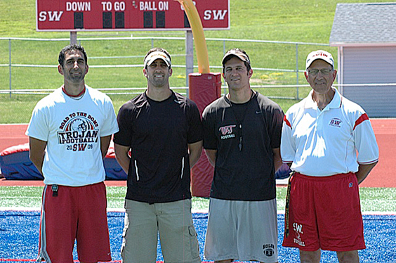 In this file photo, Fran Sirianni, far right, stands in the end zone at Charles A. Lawson Field at the sports complex that bears his name on the campus of Southwestern Central School. Joining him, from the left, are his sons, Jay, Nick and Mike. The four men will be the subject of an interview by the Rev. Roy Ferguson during his Father’s Day message at the 10:45 a.m. service Sunday at Busti Church of God. Ferguson prerecorded a live interview with Fran and Jay and he did a Zoom chat with Mike and Nick. The service can be accessed live through the church’s website — busticog.org — or on demand on the Busti Church of God YouTube channel.