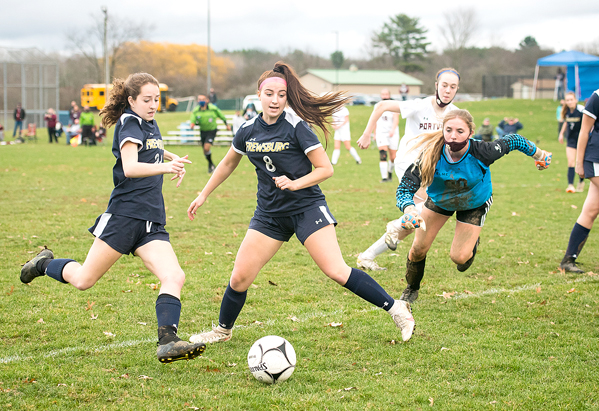 - Frewsburg’s Makenna McBride, left, and Madison Caflisch, center, converge on a loose ball in front of Portville keeper Faith Capito, right, before McBride’s goal in the 72nd minute of Wednesday’s Section VI Class C semifinal at the Robert H. Jackson Athletic Complex in Frewsburg. P-J photo by Valory S. Isaacson