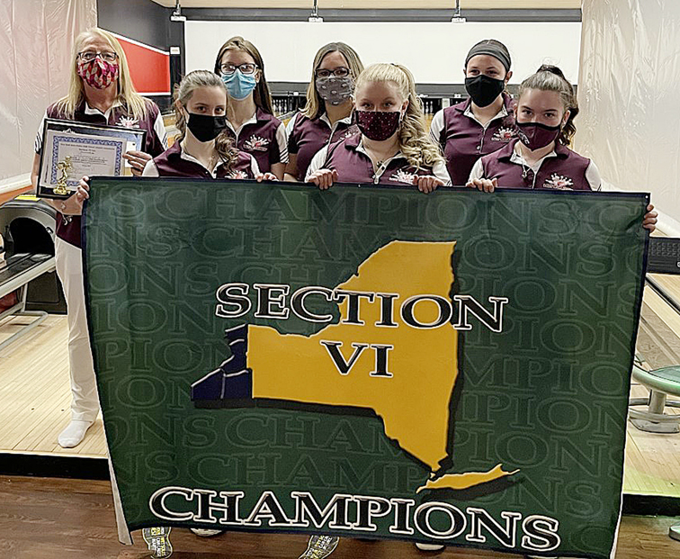 - Dunkirk won the Section VI overall, Division 2 and Class C girls bowling titles Wednesday at Airport Lanes in Cheektowaga. Pictured, in front, from left, are: Olivia Corbett, Makayla Pasierb and Rachel Glowniak. In back are: Coach Donna Kubera, Tayler Skelly, Summer Clark and Hayden Cerrie. Submitted photo