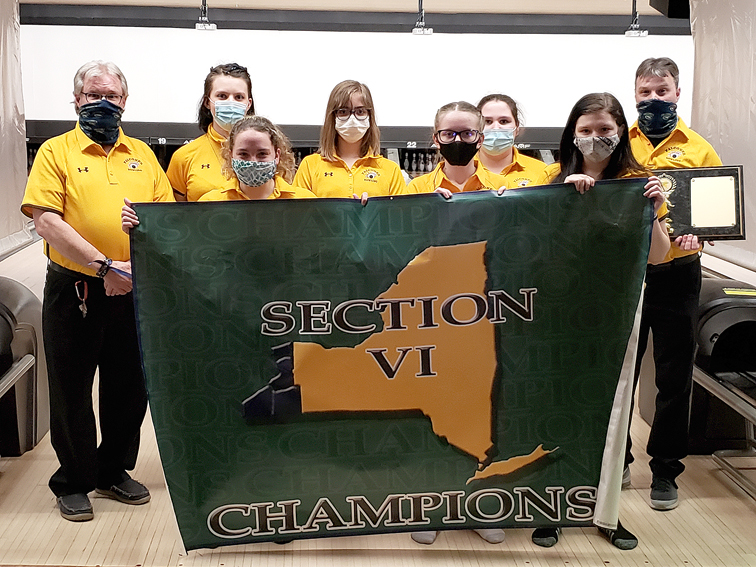 - Falconer won the Section VI Class D girls bowling title Wednesday at Airport Lanes in Cheektowaga. Pictured, in front, from left, are: Hannah Cross, Kaitlyn Swan and Lucinda Patterson. In back are: Coach Chuck Ryberg, Amelia Sprague, Rachael Wallace, Rachel Himes and Coach Jeff Camp. Submitted photo