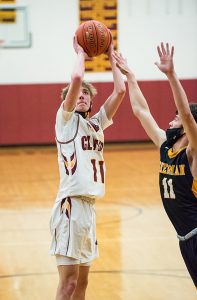 Clymer’s Hunter Wassink takes a jumper during Saturday’s Section VI Class D final against Sherman in Clymer. P-J photo by Valory S. Isaacson