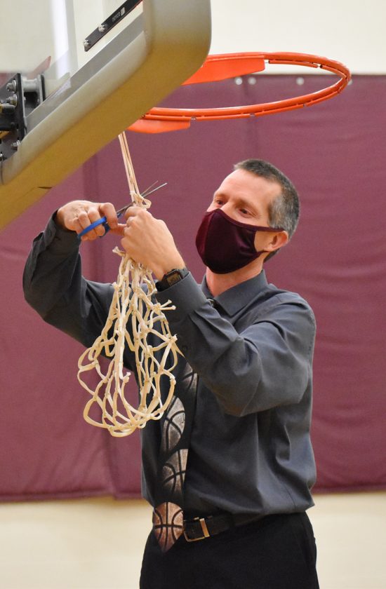 “Honestly, there will be a picture of this team that will probably have this mounted somehow with it at the house,” he said as the remainder of the net covered a portion of his necktie that had — appropriately — basketball images on it. “They’ve been a special group. In the year of COVID, we truly talked about every day just being a great day to play ball. That kind of became a motto.”