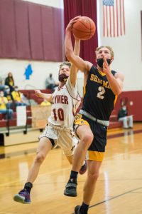 - Sherman’s John Swabik (2) takes the ball to the basket in front of Clymer’s Bishop Kopta during Saturday’s Section VI Class D final in Clymer. P-J photo by Valory S. Isaacson