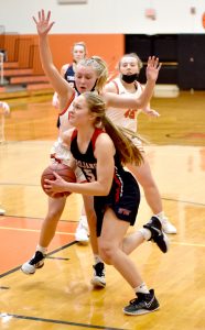 - Southwestern’s Reece Beaver (5) drives on Wilson’s Kenzie Beyer during Saturday’s Section VI Class B2 final at Wilson’s Richard J. Zipp Athletic Center. P-J photo by Matt Spielman