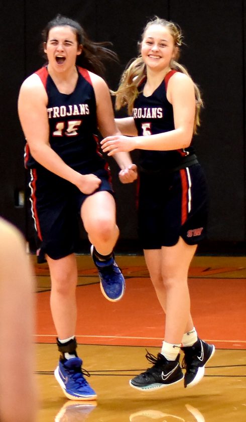 Reece Beaver and Trojans senior Sofia Genareo celebrate after the final buzzer. P-J photo by Matt Spielman