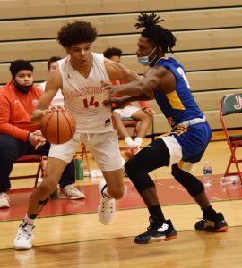 Jamestown’s Simeon Leeper attempts to get by a West Seneca West defender during their ECIC Division 1 basketball game Wednesday evening at McElrath Gymnasium. P-J photo by Scott Kindberg