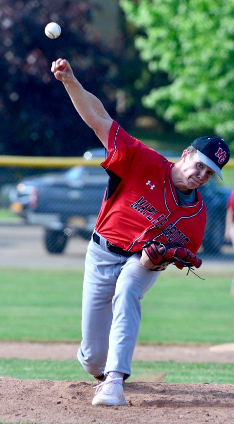 - Maple Grove’s Tucker Fenton delivers to the plate during CCAA Division 2 West action against Chautauqua Lake on Monday in Bemus Point. P-J photo by Scott Reagle