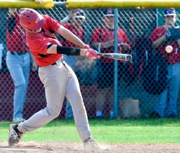 - Maple Grove’s Colin McPherson hits a single during Monday’s CCAA Division 2 West game against Chautauqua Lake in Bemus Point. P-J photo by Scott Reagle