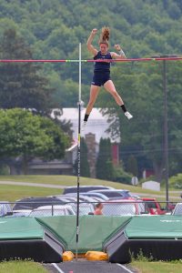 Southwestern’s Cassidy Allen clears the bar during the pole vault competition at the Section VI Class C Track & Field Championships at Allegany-Limestone on Saturday. Allen ultimately set a New York state girls Division 2 record of 13 feet, 6 inches, breaking her old record of 13-3. P-J photo by Tim Frank