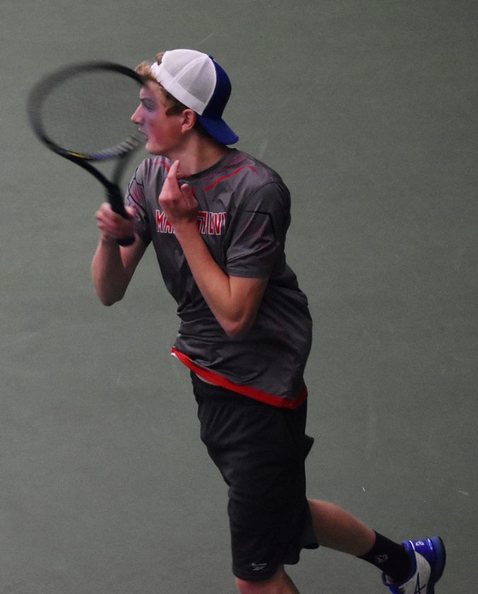 Maple Grove’s Porter DeMink returns a volley during his first-singles match against Albion in the Section VI Team Championships at the Lakewood YMCA on Thursday. The Red Dragons won the match, 5-0.