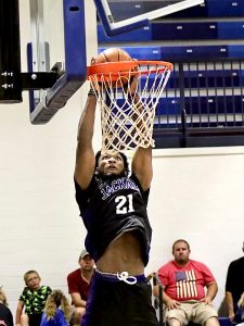- Jamestown Jackals’ Freddie McSwain goes up for a dunk during Wednesday’s 116-95 The Basketball League Eastern Conference playoff win over Carolina at Warren Area High School. Photo by Cody Elms
