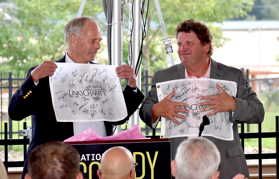 - Peter Sullivan, left, and Mike Roberts, LINKS Charity co-chairmen, are pictured with hole flags signed by 26 LPGA pros at a dinner reception held Monday night at the Comedy Center in Jamestown. P-J photo by Scott Kindberg