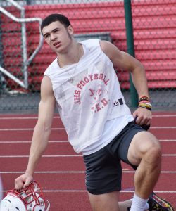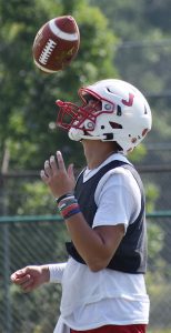 - Jamestown’s Jaylen Butera takes a break during Red Raiders’ practice at Strider Field. P-J photo by Scott Kindberg